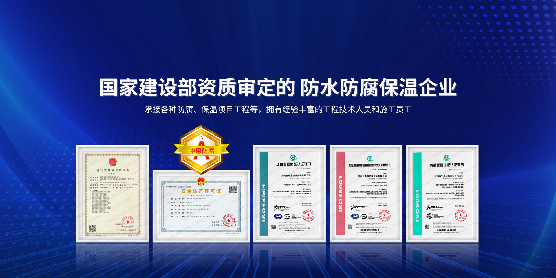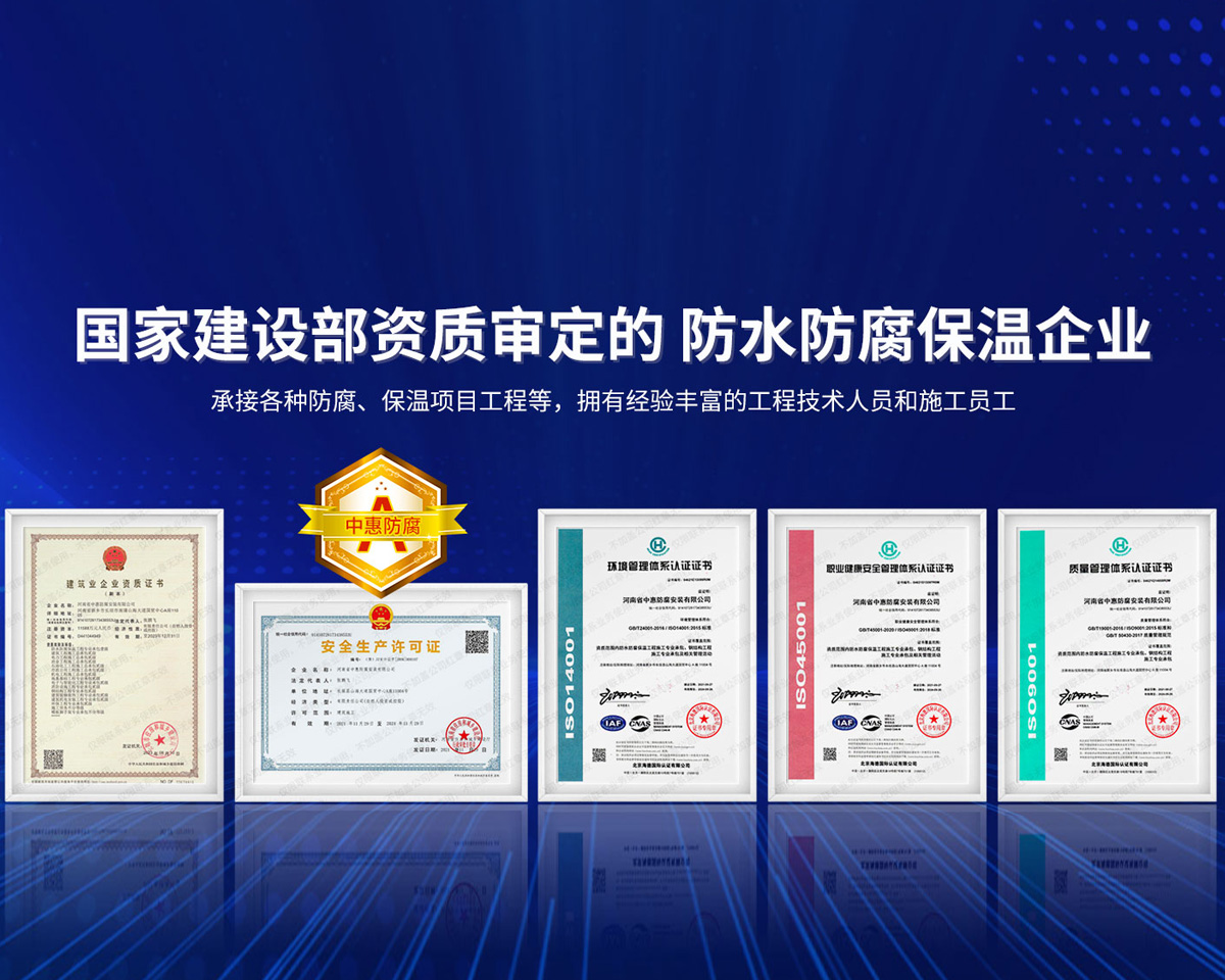 公司經營范圍:防水防腐保溫工程;消防設施工程;建筑裝修裝飾工程;建筑機電安裝工程;電力工程;建筑工程;石油化工工程;工業(yè)清洗工程;油罐清洗工程;鋼結構工程;環(huán)保工程;模板腳手架工程;電纜防火封堵、防污閃噴涂、外墻外保溫工程;各類施工勞務作業(yè);設備維修、船舶鉚焊、涂裝;電力工程材料、建材、防水材料、防火材料、防腐保溫材料銷售,并相繼通過了GB/T19001-2008idtISO9001:2008GB/T50430-2007質量管理體系認證證書。GB/T24001-2004idtISO14001:2004環(huán)境管理體系認證證書。GB/T28001-2011idtOHSAS18001:2007職業(yè)健康安全管理體系認證證書。公司是中國防腐蝕于防護協(xié)會、中國施工企業(yè)管理協(xié)會、電力協(xié)會和中國鋼結構防水協(xié)會會員單位。 公司的經營業(yè)務涵蓋了石油、化工、電力、冶金、煤炭、船舶、國防、燃氣、水利、環(huán)保、交通運輸、航空及國防軍工和輕紡市政等行業(yè)的防腐保溫絕熱設備。鋼結構安裝、防火、防水、金屬噴鍍、聚脲噴繪、陰極保護、防滲透堵漏、玻璃鋼及各種磚版材料襯里、橡膠襯里、煙氣硫和耐酸溶劑腐蝕等工程施工。公司連續(xù)十年榮獲“省市先進施工企業(yè)”“安全生產先進單位”“重合同,守信用企業(yè)”和“AA***資質企業(yè)”的稱號。2000年被命名為市級文明單位,2002年被國家工商行政管理局命名為“重合同,守信用的企業(yè)”、被中國工業(yè)防腐蝕技術協(xié)會命名為“防腐蝕企業(yè),能源節(jié)約及環(huán)境保護領域有豐富的經驗和***的業(yè)績。工程一次交驗合格率100%。其中攀枝花鋼鐵公司煉鐵廠四號高爐及熱風爐防腐工程、上海寶鋼公司煤氣柜防腐工程、撫順石油一廠裝置防腐項目、齊魯石化公司稀烴廠高塔防腐工程、吉林化學工業(yè)公司煉油廠油罐防腐工程、天津石化熱電廠六號爐頂棚聯(lián)絡管保溫工程、大慶油田(太倉)力神泵業(yè)工程、中國化學工程第十一建設工程、中原油田勘探局工程、中國石化銷售有限公司華北分部、魯皖輸油管道工程、貴州開磷息烽合成氨工程、陜西黃陵煤化工程、中國石油天然氣西部管道塔里木輸油工程、邯鋼集團邯寶鋼鐵公司煉鐵工程、德州供電工程、吉寶(南通)船廠工程,偃師華潤熱力工程、鄭州熱力總公司。 河南省中惠防腐安裝有限公司愿以豐富的施工經驗,***的技術,***的設備,***的管理,***的服務,竭誠為國內外廣大的用戶提供***滿意、******的工程作品。 我公司愿與國內外同仁一道,團結協(xié)作,共同推進防腐蝕行業(yè)發(fā)展! 公司地址:河南省長垣縣建設路北段360號 固定電話:0373-8866488 郵編:453400 網(wǎng)址:http://www_zhff_com_cn.rx-n.com